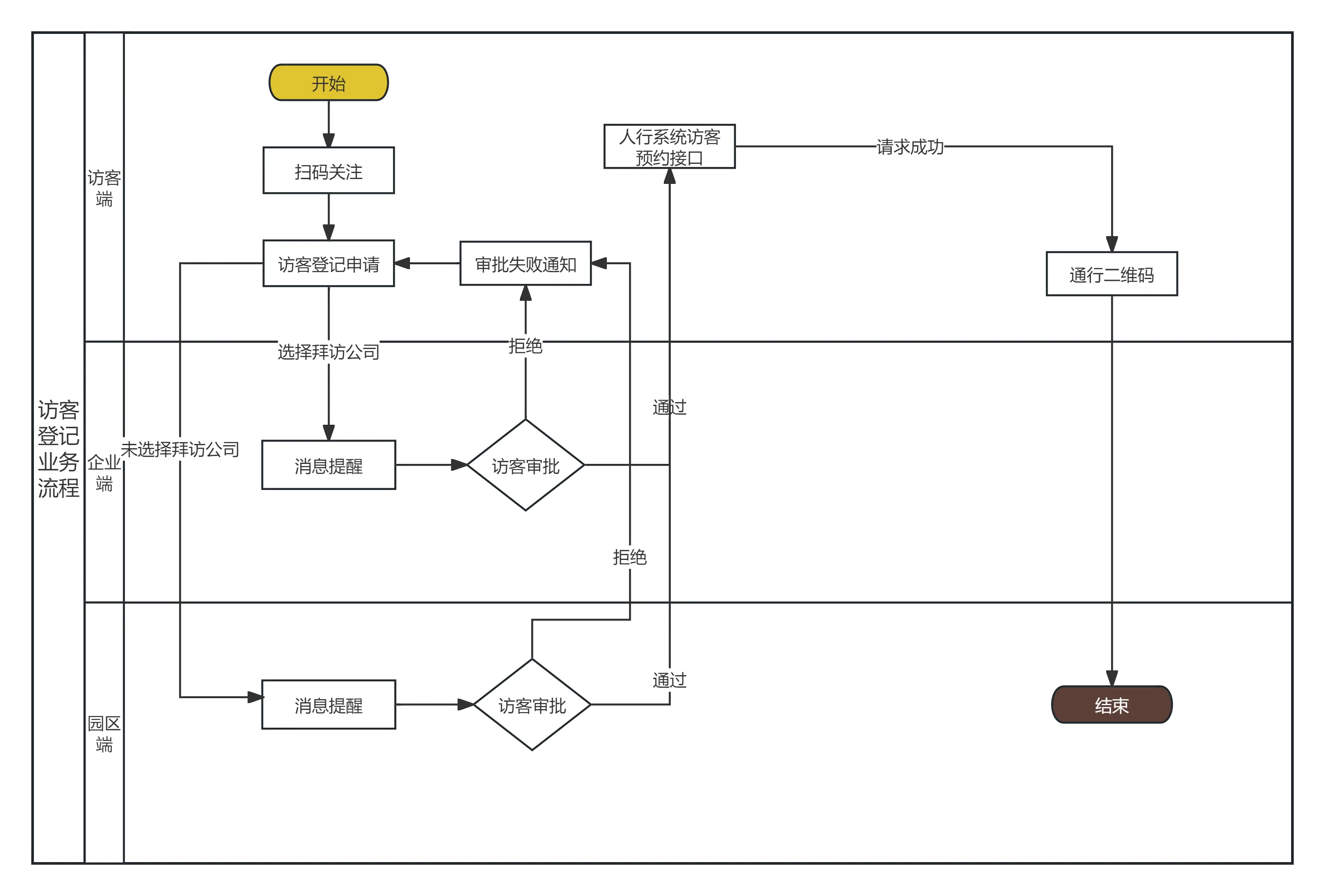 - 未审批的访客登记显示审批通过和审批拒绝按钮;点击审批拒绝按钮,弹窗显示审批拒绝页面,操作完成,审批状态:已拒绝;点击审批通过按钮,弹窗显示审批通过页面,操作完成,请求人行系统的访客预约接口,请求成功,根据返回信息生成通行码并修改访客状态为已通过;