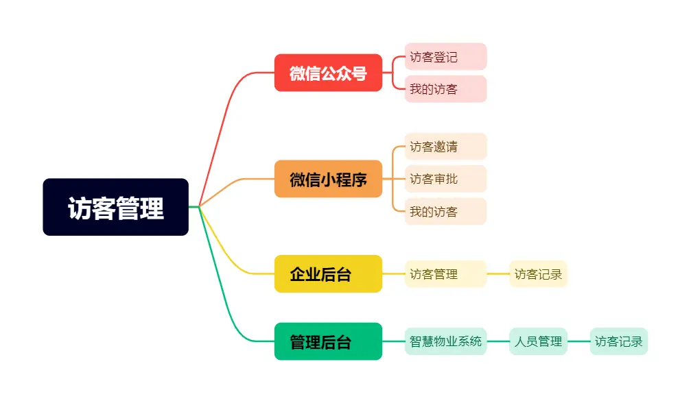 访客管理产品需求文档 一、简介 智慧园区访客管理系统是一种针对园区内访客管理的解决方案,旨在提高园区安全、提升访客体验和管理效率。该系统通过整合身份验证、预约、门禁控制、导航指引等功能,为园区管理者和访客提供便捷、智能的服务。 1.1 目的软件需求是软件开发的依据,也是软件工程各项活动的基础。编写本PRD的目的就是将访客管理的需求清晰准确地描述清楚,为制定项目开发计划和后期的概要设计、原型设计、测试等阶段的工作提供可靠的依据。 1.2 范围本文档阅读对象为产品经理、项目经理、UI设计师、开发工程师、测试工程师。 二、客户端角色描述 三、产品概述 访客管理系统是智慧园区重要的组成部分和基础,通过访客管理系统可以高效科学的管理园区的访客信息。 3.1 总体功能架构图 3.2 业务流程3.2.1 访客登记 3.2.2 访客邀请 四、 功能需求说明 4.1 微信公众号4.1.1 访客登记 页面设计 访客登记 添加车辆 车辆列表 需求说明 - 访客登记,用于访客角色填写访客登记信息,并根据拜访公司的通行区域,请求富士星云的访客预约接口,生成通行码;