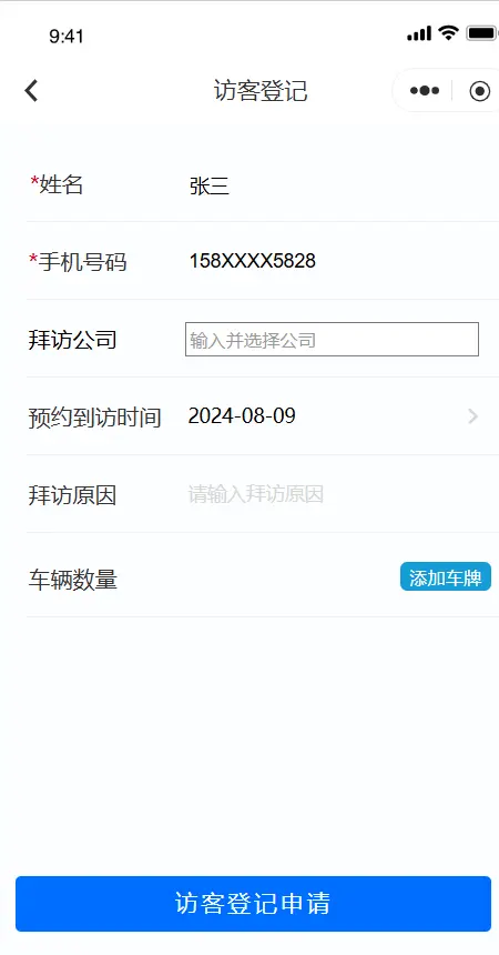 - 访客登记时,姓名、手机号码必填;姓名、手机号码默认根据登录用户信息显示,可修改;预约到访时间默认今天,可选择不小于当天的日期;