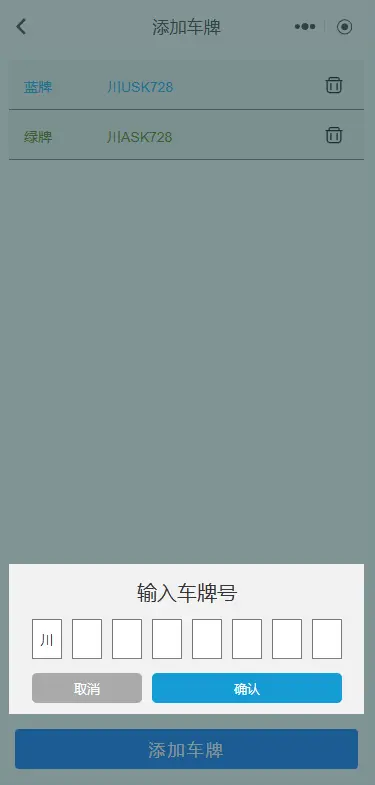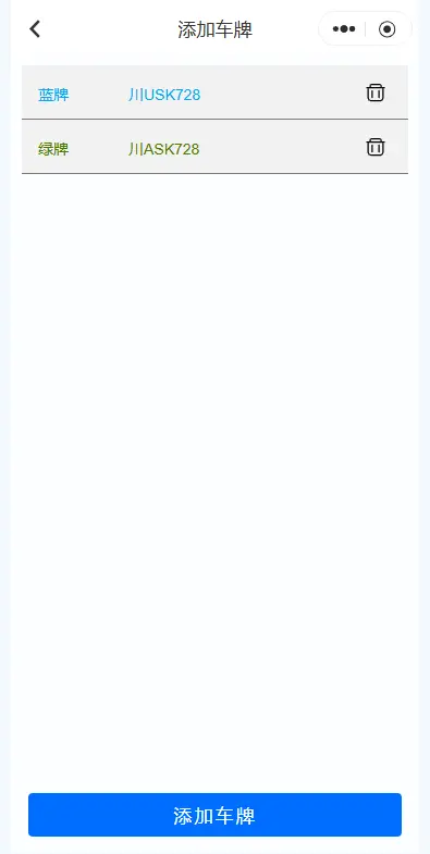 - 点击添加车牌按钮,跳转到添加车牌页面;添加车牌页面,可添加8位车牌信息;车牌号码为7位,车牌颜色为蓝牌;车牌号码为8位,车牌颜色为蓝牌;