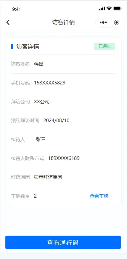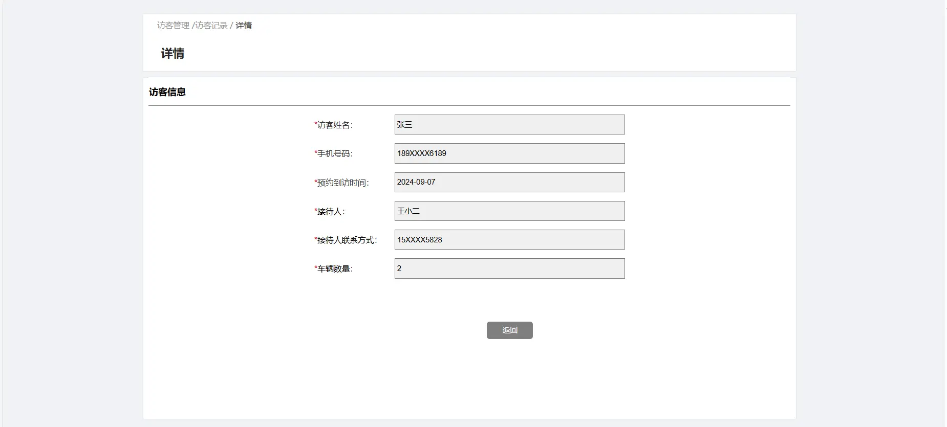 - 访客详情页面,用于展示访客登记和访客邀请的访客详情信息,访客详情页面展示内容包含:访客状态、访客姓名、手机号码、拜访公司、预约拜访时间、接待人、接待人联系方式、拜访原因和车辆数量。