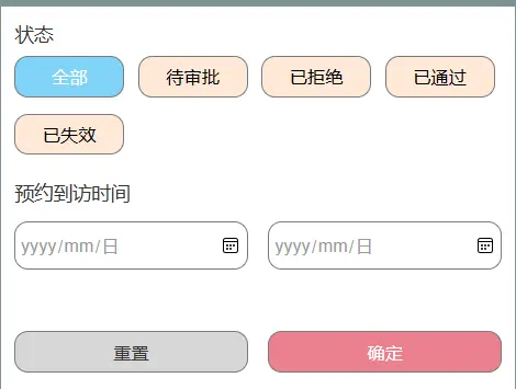 - 点击筛选按钮,弹窗显示筛选页面;筛选页面,支持访客预约状态和预约到访时间查询;