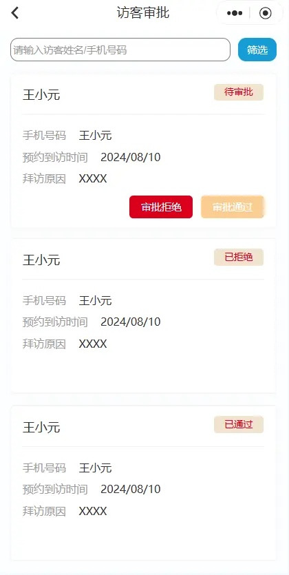 - 访客记录展示信息:拜访公司、审批状态、访客姓名、预约到访时间和拜访原因。