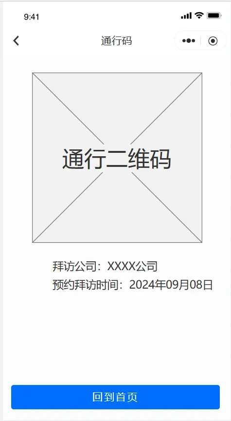 - 通行码页面包含:通行二维码、拜访公司、预约到访时间和回到首页按钮。