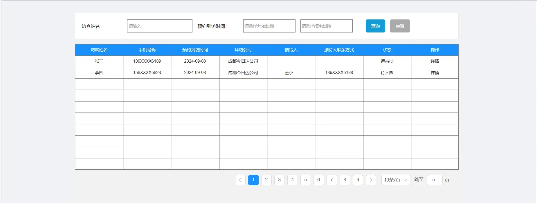 - 支持:访客姓名和预约到访时间查询;访客姓名,支持模糊查询;预约到访时间支持时间段查询,精确到天;