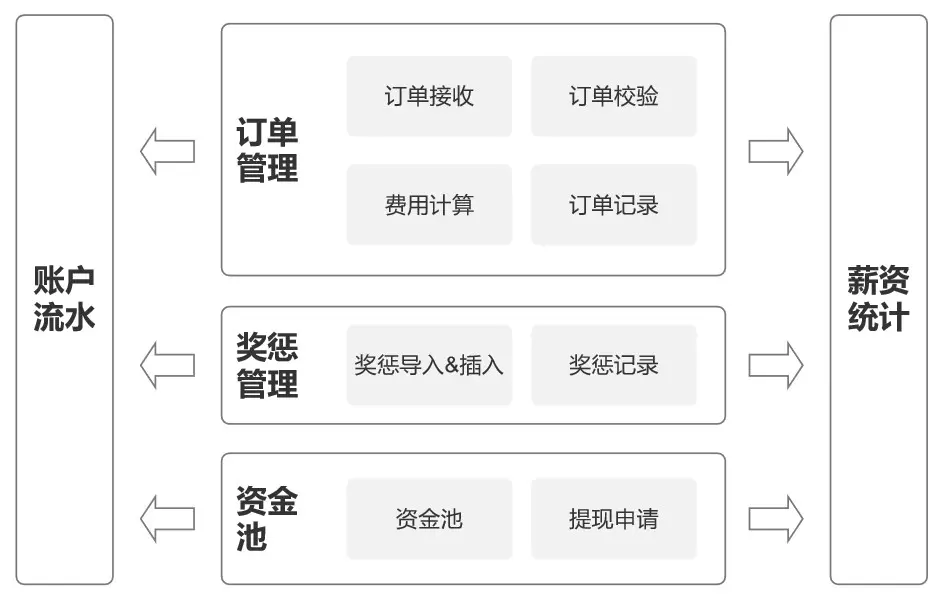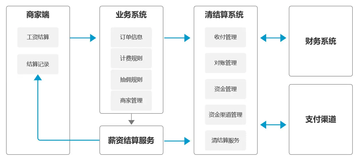 正常来说,薪资的结算也是资金结算,是应该放到结算系统中实现的(如果业务线少且复杂程度不高,这样处理也是可以的)。 但是结算系统主要是用来给财务打款的,而薪资结算的部分规则是由各条业务线自己进行把控的。如果业务线过多、太复杂,不论是从使用权限上看,还是从系统解耦上看,都不适合将薪资结算和结算系统放在一块。 另一方面,虽然不同的业务线对于上面说的“分蛋糕”有不同的逻辑,而且每条业务线有自身的发展节奏和财务预算,不可能用一个分配逻辑来完成全部的分配,但是考虑到资金的安全性以及避免各条业务重复造轮子,也应该将薪资结算与更靠前的业务系统分离开。 所以,薪资结算系统可以作为一个介于业务侧系统和结算系统中间的系统而存在,根据业务发展的实际情况来决定放在哪一侧或者是独立。 ![]() 为了保证资金的安全以及打款的规范,在薪资系统完成结算后并不能真正完成打款。薪资结算的请求会通过清结算系统,有需要的话还需要财务进行核对和审批,完成以上步骤后才会经过支付渠道将薪资转入商户的账户中。 02 薪资结算系统的架构 ![]() 一个简单、通用的薪资结算系统包含这些部分。