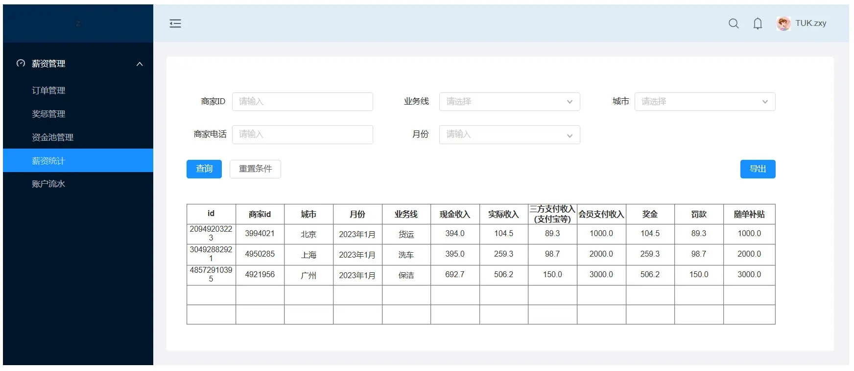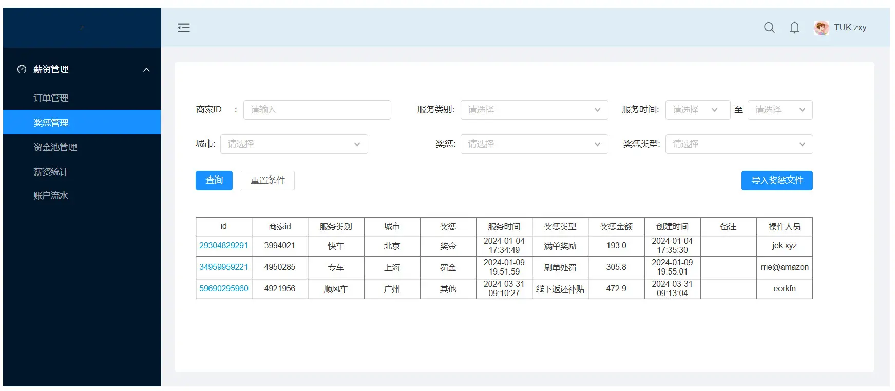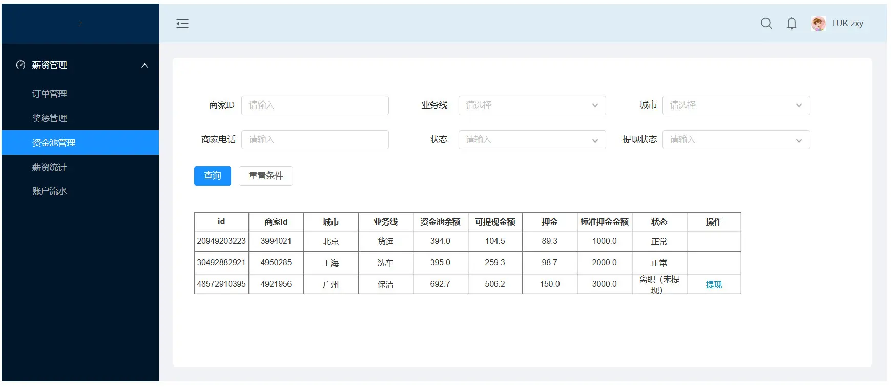 ![]() 后台Web页面中的订单管理模块,主要是对薪资系统获取的订单进行展示和查询,参考原型设计如下。 ![]() 2. 奖惩管理在互联网各个分类中,O2O业务是很重线下运营的。平台运营人员没法通过系统知道商家在现场服务时到底发生了什么事情。往往需要电话联系用户和商家,由双方分别提供现场照片才能了解情况。特别是在处理用户投诉时,需要进行多次沟通,通过线下协商完成处理。另一方面,在前期业务探索期,对于商家的奖惩可能存在灵活调整的问题,需要运营进行经常性操作。即便业务成熟、奖惩机制固定,部分奖惩可以通过用户/商家申请-运营审批通过的方式实现,也难以避免需要手工调整的情形。所以有必要给平台运营一个导入奖惩的入口。 ![]() 导入的奖惩字段及校验可以参考以下这些。 ![]() ![]() 3. 资金池管理资金池管理主要用于查看商家各项汇总金额。此外,因为部分商家非正常离职(比如运营人员在后台操作解约)后有未提现资金,需要运营人员在后台手工操作提现。参考页面如下。 ![]() 如运营发起提现,则需要对商户状态、提现次数、提现金额、银行卡信息等进行校验。校验通过才能完成申请,之后由财务人员进行审批,如此才能完成提现。 ![]() 关于可提现金额、押金、标准押金金额需要额外说明。 可提现金额:资金池余额并不等于可提现金额,因为部分资金是有账期的,未到账期则不能提现;因为部分业务存在给商家预支劳动工具的情形(比如家政),需要按月扣除工具的磨损;此外,还有部分资金池余额需要用以补足押金。 押金&标准押金金额:押金的标准在各条业务线、各个城市都可能不同。如果商家因服务问题被投诉,可能会扣除押金;当押金扣减到一定程度(比如低于标准金额的40%),商家会被暂停接单。一旦出现商家实际押金低于标准押金的情况,那么就需要商家自行充值补足;或者是在完成一次服务&服务费度过冻结期后,由系统自动扣减进行补足。如果订单收入还不足以补足押金,在下次结算月薪资时还要继续补。 4. 薪资统计财务给商家结算薪资前,需要报表统计商家当月的收入、补贴、奖金、出勤天数、好评率等信息,以此作为发薪的依据。对于具体的字段,各条业务可能存在不同(比如出勤及磨损费就不适用于快车专车类的业务)。参考的字段及后台原型如下。 ![]() ![]() 其中,服务项目上接收订单、奖惩等是进行实时统计的; 而上月订单中好评率、出勤天数、保底等无法实时统计,需要进行按月统计。这里提供一个计算的思路: