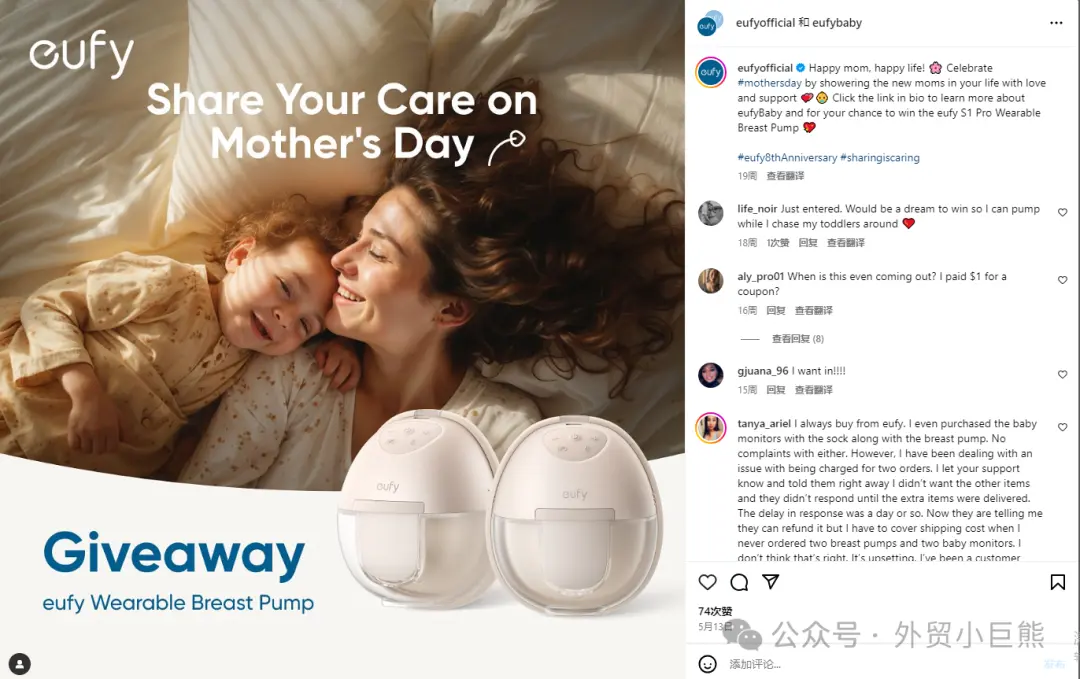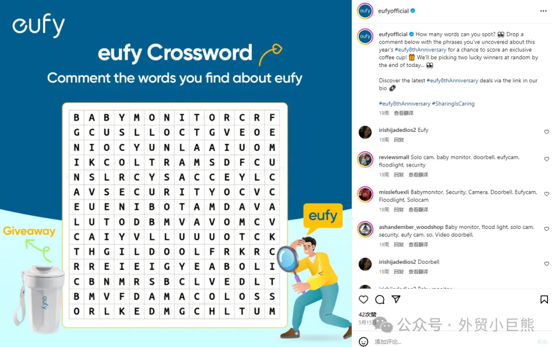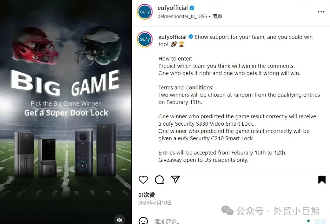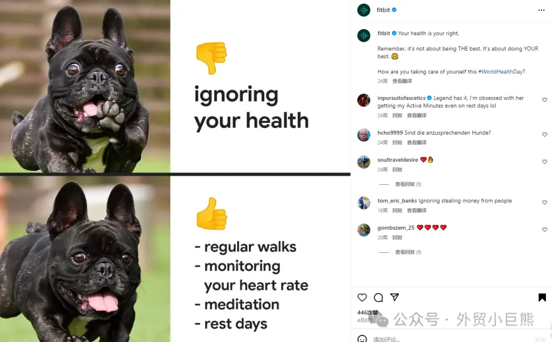 ![]() 图片来源:Eufyofficial 三、Giveaway Giveaway也是比较常见的活动了,主要目的吸引用户参与,涨粉或者提高品牌曝光等。 Eufy在母亲节发起了”Share Your Care on Mother’s Day“为主题的giveaway活动,鼓励用户参与活动,用爱和支持新妈妈,有机会赢取eufy S1 Pro。 ![]() 图片来源:Eufyofficial 四、趣味互动 通过有趣的问答,小游戏等增加用户参与感,品牌认知度,以及促进用户对产品的兴趣和了解等。 Eufy 8周年庆的#eufy8thAnniversary 通过呈现一个色彩丰富的填字游戏,引入了与Eufy产品相关的词汇,如’baby monitor,’ ‘security,’ ‘doorbell,’ ‘eufyCam,’ ‘floodlight,’ 和 ‘solo cam.’等 活动中还有一个人拿着放大镜的插图,增加了趣味性。 文案中使用’Comment the words you find about eufy’ 鼓励参与者通过分享他们找到的词汇来互动。 ![]() 图片来源:Eufyofficial 五、Behind the scenes 展示品牌的幕后故事,产品制作或团队工作的日常等,增加人情味。 Eufy通过邀请用户一起参与海洋保护,强调了活动对海洋保护的承诺,并提供免费参与的机会。有效提升品牌形象,让用户了解其价值观和社会责任感。 ![]() 图片来源:Eufyofficial 下面Eufy的Instagram发展历史帖子展示了品牌从成立到发展壮大的历程,通过时间线的形式清晰展示品牌的起源和里程碑事件,增强用户对品牌的认知和了解。 同时也可以增加用户对品牌的信任感,毕竟通过这个时间线,可以一目了然知道品牌有接近10年的历史了。 ![]() 图片来源:Eufyofficial 六、How to教程类视频 提供使用产品的步骤或技巧,有用的教程内容等帮助用户更好地理解产品或者成为更好的自己。 比如Makeup Forever发布化妆教程视频,向用户展示如何使用化妆品和更好的化妆。 Fitbit 品牌的教程视频”How to reach your fitness goals faster”. ![]() 图片来源:Fitbit 七、KOL合作内容 KOL通常具有独特的内容创作风格,可以带来新鲜的视角和创意,增加内容的吸引力。品牌通过KOL的粉丝群体,可以接触到新的潜在客户,扩大品牌的影响力和促进转化。 品牌在获得KOL授权后可以在社媒转载或者分享KOL视频,尤其是Instagram平台,一些优质的KOL如果能直接邀请品牌方为合作者,将会给品牌方的社媒带来不错的流量,涨粉或者订单转化。 像我之前合作的一些优质KOL,只是正常的产品推广,都有给我们品牌方自己的社媒带来几千新粉丝,100多个订单。如果要追求涨粉,跟KOL一起做活动无疑是效果最好的方式之一。 ![]() 图片来源:Dreame.usa 八、媒体背书内容 通过展示媒体报道,提升品牌的可信度,塑造专业形象。 比如yunmai品牌就非常喜欢在社媒展示来自媒体或者运动员的评论,突出产品的实用性和效果,增加了潜在消费者的信任感。 ![]() 图片来源:Yunmai 九、促销贴 宣传限时折扣或促销活动,刺激购买欲望。 下面Eufy的黑五促销中的三个帖子,右侧展示了现代、简约的室内布置和Eufy的安防和智能家居设备,暗示正在打折销售的产品类型。文字”Up to 55% off”突出显示了产品的折扣幅度。”Don’t Miss Out!”和”Grab Your Black Friday Discounts Now!”鼓励用户立即行动,促进销售。 所以假如你也是做智能家居产品的,如何在一个相对较小的空间展示更多正在做促销活动的产品?Eufy的社媒帖子是很好的例子。 ![]() 图片来源:Eufyofficial 十、UGC帖 用户生成的内容通常比品牌自家宣传更具可信度,能有效提升潜在客户的信任感。相比于传统广告,UGC通常成本较低,因为内容是由用户自发生成的。也可以由品牌方引导,鼓励用户分享自己的体验和故事,增加品牌与受众之间的互动。 品牌方可在自己的社媒二次传播优质UGC帖子,展示真实的用户体验,为潜在客户提供参考。 像GoPro,Oppo等品牌都会定期分享用户拍摄的精彩视频和图片,展示产品的实际应用。一些安防类的品牌比如vivint,wyze则会分享用户使用摄像头抓拍的精彩瞬间,温馨瞬间,搞笑瞬间等。不少温馨的UGC视频吸引了粉丝的强烈讨论。 十一、Meme贴 Meme营销正在迅速发展成为品牌可以采用的最有效的社交媒体营销策略之一。它通常以图片或 GIF 形式呈现,具有幽默感,可通过 Twitter、Facebook 和 YouTube 等社交媒体渠道在互联网上快速传播,深受年轻人喜爱。 Meme通常反映了某种文化趋势和社会现象,常常表达一种共同的经历或情感。它们易于识别和共鸣,因而高度可分享。在营销背景下,Meme可以用来以轻松和吸引人的方式传达品牌信息,品牌也可借势/借热点营销。 Fitbit通过轻松幽默的Meme图,使健康管理的话题变得轻松有趣。 ![]() 图片来源:Fitbit 十二、Before&after贴 展示使用产品前后的对比,强调产品效果。对比前后的状态,清晰地展示改进或转变,易于理解。这种类型的帖子适用于多种行业,如美容、健身、家居改造等。 Fitbit品牌通过“运动前后”的对比,直观展示腿部锻炼的效果。将意大利面与腿部肌肉的形象结合,增加趣味性,轻松幽默的表达方式,降低健身的紧迫感,同时生活化的比喻增加了品牌的亲和力。 ![]() 图片来源:Fitbit 十三、时事热点 结合当前热门话题或事件进行相关内容创作。与当下热门事件结合有助于增加品牌曝光和话题性,吸引用户关注和参与。 Eufy的Super Bowl超级碗活动贴,巧妙地将Eufy产品与美国热门体育盛事结合。 ![]() 图片来源:Eufyofficial 十四、节日营销 围绕节日主题制作特别内容或促销活动。如圣诞节、万圣节等,增加节日氛围和用户参与度,提升品