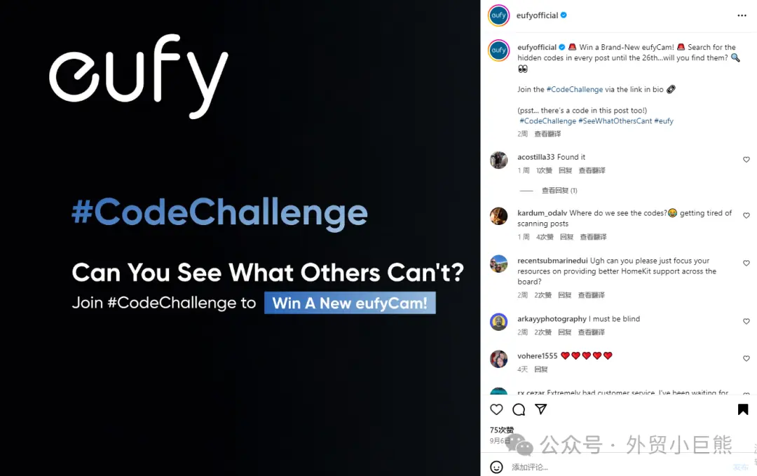 海外社交媒体帖子的类型非常多样,可以根据内容的形式、目的和互动方式进行分类。一般涵盖品牌推广、用户互动、教育内容、娱乐内容、促销活动、社区建设、时事热点、行业洞察与市场趋势7大方面。以增强用户参与、提升品牌形象并促进销售转化为目的。而在这7个大的板块中,下面又可以细分更多的帖子类型,加起来好几十种不同类型的帖子,但是我们在策划内容的时候,不需要所有类型的帖子都要想办法展示出来。你能好好策划这其中的几个或者十几个类型的帖子就很不错了,我今天只分享常见的18个帖子类型,收藏本文,社媒不愁没发帖灵感。 为了让大家更好的理解。今天的分享以我很喜欢的Eufy、Fitbit等品牌的社媒帖子为案例。全文4千字,认真阅读完需要10分钟;边阅读,边思考,边做笔记需要1小时;纯点赞捧场只需要4S。 一、产品贴 这个就不用多说了,展示品牌产品,强调其特点,优势,痛点解决和使用场景。 比如来自Eufy的Instagram新品发布帖子封面展示了eufyCam S3 Pro,通过夜间场景和建筑物在水面的倒影,突出了该摄像头在低光条件下拍摄清晰影像的能力。 再辅助文字强调它的专业,能看到看不见的东西,再次突出产品优势。个人特别喜欢这种科技感的,单排3张图或者双排6张图连在一起的社媒封面图,看起来爽心悦目,非常简洁突出重点。 ![]() 图片来源:Eufyofficial 二、Challenge “Challenge”通常涉及用户参与特定任务或活动。比如跳舞、唱歌或完成特定任务。参与者会创建内容并标记相关的标签(如#ChallengeName),以便其他人能够找到这些内容。 由于Challenge往往具有趣味性和挑战性,它们容易在社交媒体上迅速传播。参与者的朋友可能会受到启发,进而加入挑战,形成病毒式传播效应。对于品牌方而言,企业能够吸引大量用户参与,从而增加品牌曝光和用户互动。 近期Eufy为了给新品预热,发起的Search for the hidden codes #CodeChallenge活动。引导粉丝进入独立站参与活动和寻找在社媒和独立站隐藏的折扣码,通过提交折扣码和邮箱获得参与资格,有机会赢取新的eufy摄像头。这个活动可谓一举几得。