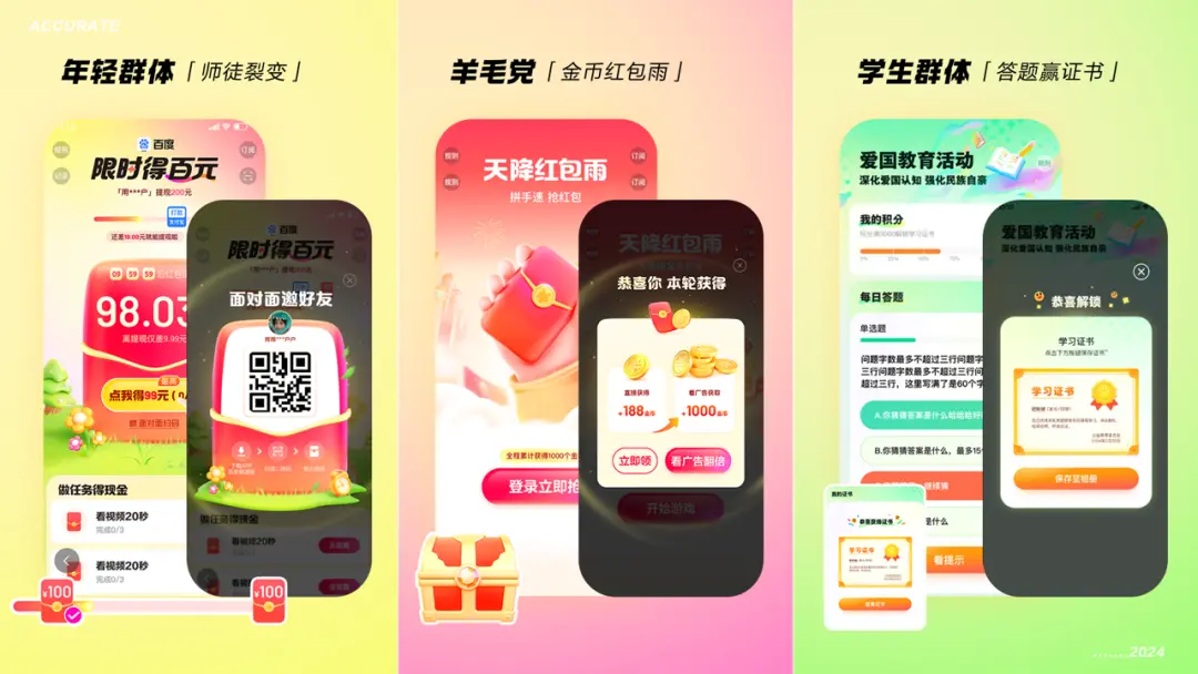 在当今这个信息爆炸、用户偏好日益多元化的时代,一刀切的运营活动已难以满足市场的多样化需求。为了有效提升用户参与度、增强品牌忠诚度,我们必须学会精准细分用户,从玩法和视觉两个维度出发,定制个性化的运营活动。 本文将以百度APP任务系统长线活动为例,阐述我们如何通过精细化用户分析,结合创新玩法设计与视觉呈现,打造一场运营盛宴。 一、精细化用户分析 1. 细分维度的选择与构建在构建用户画像之前,首要任务是精准界定细分维度,这一过程中,目标导向性应作为核心指导原则。 首要步骤是深入理解用户参与特定任务的动机与核心关注点,通过行为维度的详尽分析,我们能够捕捉到用户活跃时段、任务完成频率及类型等直观数据。 这些数据如同透镜,透视出用户的兴趣所在及参与模式,进而识别出最受欢迎的任务类型与用户偏好的参与时段。 ![]() 然而,要全面洞悉用户,仅凭行为数据显然不足,心理维度的探索同样不可或缺。 基于现有数据基础,我们深入挖掘用户参与背后的内在驱动力,如部分用户可能受成就感驱使,对积分累积与成就达成尤为热衷;而另一部分用户则可能更享受游戏化的互动体验,乐于分享任务成果。 此外,人口分层与技术维度也是分析用户画像时不可忽视的重要方面。人口维度广泛覆盖了用户的年龄、性别、职业背景及地理位置,这些特征差异往往导致使用习惯与偏好的多样化。 技术维度则聚焦于用户的设备类型与网络连接状况,直接关联到用户体验的流畅度与任务参与方式的灵活性。 同时,社会及环境变迁对用户行为的影响亦不容忽视,如后疫情时代促使年轻一代更加关注自我成长与精神层面的追求。 因此,在制定长期运营策略时,需灵活应对不断演变的社会因素,构建能够精准匹配每位用户独特需求的个性化产品与服务,实现“千人千面”的精细化运营。 ![]() 2. 构建详尽的用户画像在构建任务系统用户画像时,通过对数据和目标导向的细致挖掘,我们可以将任务系统用户划分为多个群体。