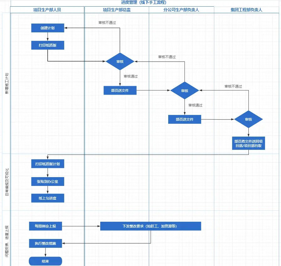 一、核心业务流程 通常我会从用户行为路径出发,对流程中涉及到的角色、场景等进行串联,搭建核心业务流程与分支流程,拿上方所提项目举例,与业务方调研后获得进度管理业务流程如下,为线下手工作业流程: ![]() 流程简述: 1)流程图中可发现,一份计划从创建到投入使用的审批效率较低; 2)计划投入使用后,通过打印纸质版,张贴上墙的方式进行日常进度的填报,时间久了不便于查看、且易丢失,可视化效果不佳; 3)每周例会时,才进行工程完成情况/问题的汇报,时效性较差,出现问题不能第一时间采取相应措施,影响工程进度。 与项目生产部门负责人沟通了解到,他们有专门的工具进行计划编制,但工具不能提供后续的管理工作。由于计划较复杂,业务人员也习惯使用该工具编写计划,讨论后确定计划编制依然保留原线下工具编制的方式,计划编制作为一个节点,从该节点以后进行线上化管理。将工作流程(如审批流等)纳入到系统规范化管理的一部分,在系统中支持计划增删改、进度上报、工作审批、工程可视化管控等。 流程中涉及角色: 1)项目生产部人员:参与制定施工项目的施工计划、并负责实施等 2)项目生产部总监:管控工程施工全流程工作;科学组织和管理施工现场的人、材、机等各生产要素;参与施工组织设计等多项工作 3)分公司生产部负责人:对所辖项目的施工情况进行协调管理 4)集团工程部负责人:对所辖分公司与集团项目的工程进展实施监管、制定相应业务管理办法等。 以上岗位职能非标准化,各公司职责范围可能存在差异。 确定后部分业务流程图如下: ![]() 二、产品定位 主要为了更清晰的明确产品目标,产品对业务的支持范围或总体的功能目标。为谁提供什么支持。如以上案例主要是为工程企业提供施工全过程的进度监督管理、降低项目延期风险,提高企业竟争力。 将抽象的定位落到具体实施中,我一般会从系统实现形式、系统分类、不同业务人员的功能分类几个维度进行分析。 1)根据客户日常工作场景了解到,管理者通常较多时间在办公室进行工作监管、定期到项目上进行实地检查考核等,一般会有助理类岗位人员同行; 一线业务人员,较多时间在项目施工现场,很多工作基本通过手机进行处理,在类似周会/月会等情况会在办公室进行,项目前期一般也会在办公室进行项目情况梳理; 综合以上实际情况及投入产出比分析,最终确定通过PC端和移动端小程序结合实现。 2)对一线业务人员来说,需要一个方便操作工程计划相关内容的平台,因其需要对计划进行一系列的操作,若出现风险,还需进行纠偏等动作;对管理层来说,需要为其提供一套管理后台的能力,因涉及工作规范的制定、业务内容的审核等;对前面两者来说,均需要提供一个可视化模块,快速了解工程进展,因工程可视化模型的特殊性(文件格式、解析时长等不支持移动端),不便于在移动端查看,所以会在PC端进行实现。 通过以上分析,我们进一步将系统拆分为3大模块,每个模块的定位不同: